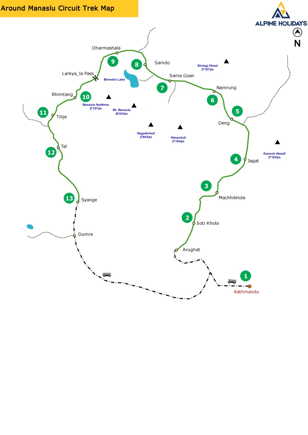 Around Manaslu Trek often called as Manaslu Circuit Trek is one of the challenging and off the beaten treks. This area is being so popular but visited by only few trekkers. It is considered as untouched to experience the local culture and nature in comparison to other established trails in Annapurna and Everest Region. Manaslu is the eight highest mountains in an elevation of 8163m in the west central part of Nepal falls in Mansiri Himal range. This is one of the most rewarding treks in Nepal which is enriched with rich culture, bio-diversity and the natural beauty, was opened in 1991 A.D and need special permit. Other peaks like Himalchuli (7,893m), Ngadi Chuli (7,871m), Shringi (7,187 m), Langpo (6,668 m) and Saula (6,235m) are the major attractions of this region. Further, Tibetan Styled Buddhist Villages, unspoiled mountains, various monasteries, Budi Gandaki River, natural pools, lakes and waterfalls added the beauty of this region. The highest pass is the Larkya La Pass in an elevation of 5,106m.