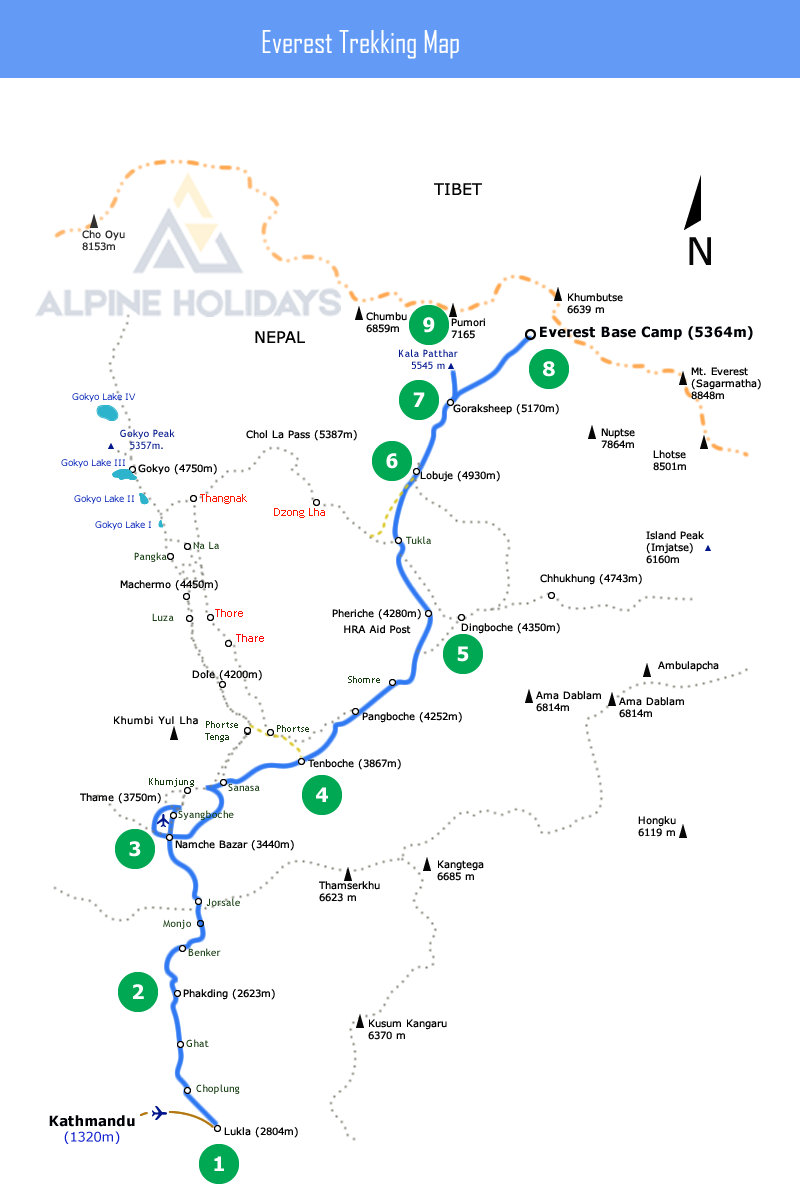 Our Comfortable Everest trek starts with city sightseeing in Kathmandu and next day, we fly to Lukla then trek to Phakding. From Phakding, we trek to the bustling town of Namche. On our extra day at Namche, we visit Khumjung village to see Yeti Scalp at Khumjung Monastery, and see Khumjung School and hospital founded by Sir Edmund Hillary. From Namche, we trek to Thame and to Kongde. From Kongde, we descend to Phakding and trek back to Lukla. From Kongde on last day, we might take helicopter to Everest Base Camp (5,360 m) and land at Kalapatthar (5,545 m). From Kalapatthar, we get the best close view of Mt. Everest, Lhotse, Nuptse, Baruntse and many others. Then we fly back to Kathmandu on helicopter or continue our trek to Phakding and to Lukla.