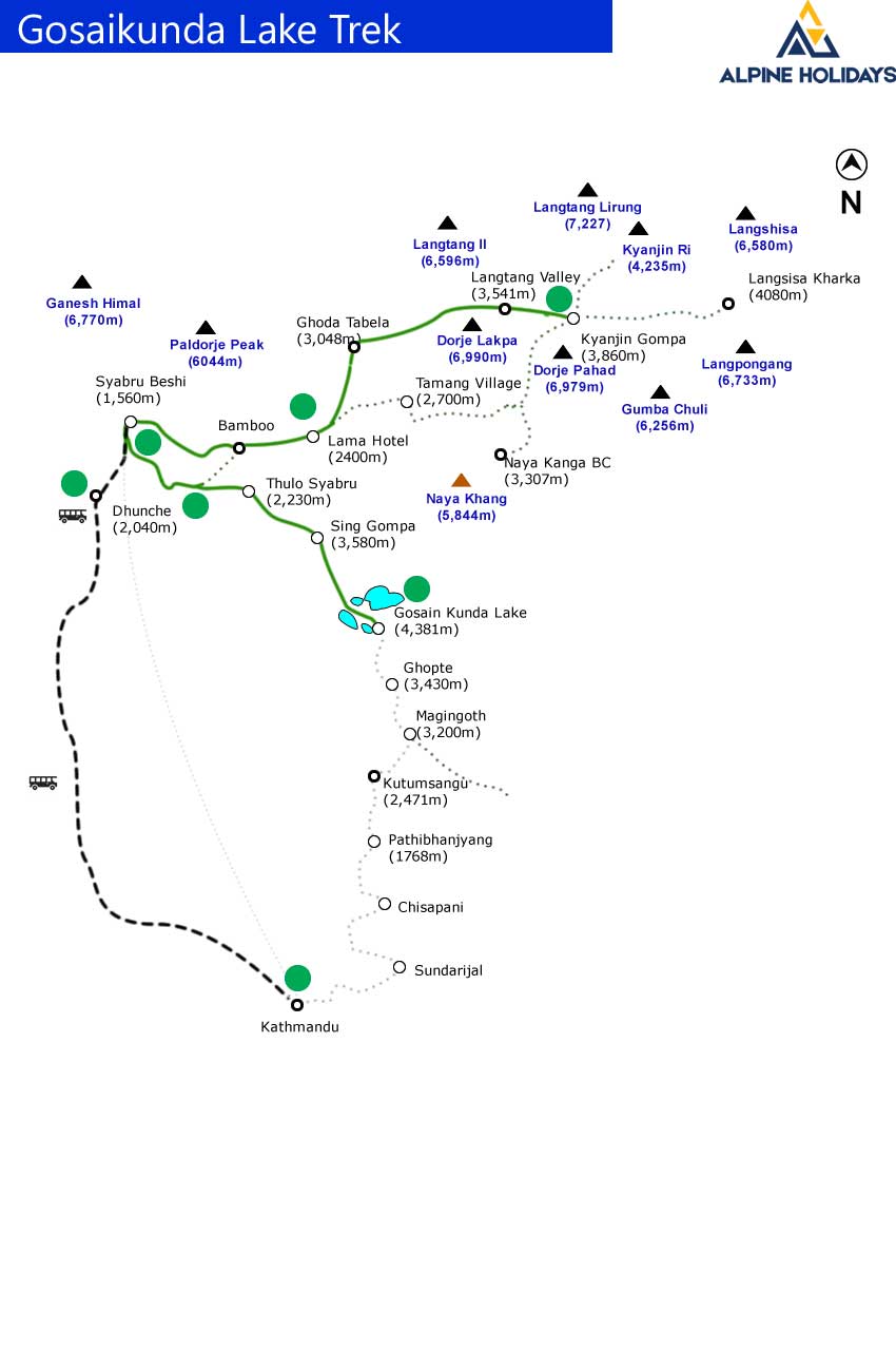 Gosaikunda Trek starts from city sightseeing in Kathmandu and next day drive to Dhunche in Rasuwa. Then we follow our trail along with the Trishuli River which is sourced from Gosaikunda Lake. Our trail goes to Chandanbari (Shing Gompa) Cholangpati, Lauribinayak and finally to Gosaikunda Lake. In this trek, we follow the same way back to Dhunche and to Kathmandu.