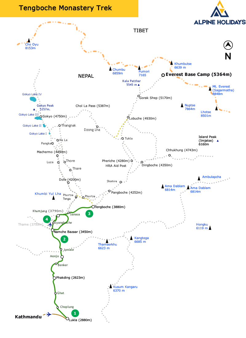 Tengboche Monastery Trek is one of the best short treks which take you to the mountains and the land of Sherpa people. This is the easy trek in the Everest Region. Though it is the short trek, takes you to view the world’s highest peaks Mt. Everest, Mt. Lhotse, Mt. Amadablam, Mt. Thamserku and many other snow capped mountains while witnessing the famous Tengboche Monastery. This is the major Buddhist Center in Everest region with residing Guru Rinpoche who blesses trekkers, mountaineers and pilgrims and believed to have a strong connection with its mother monastery in Tibet called Rongbuk Monastery.