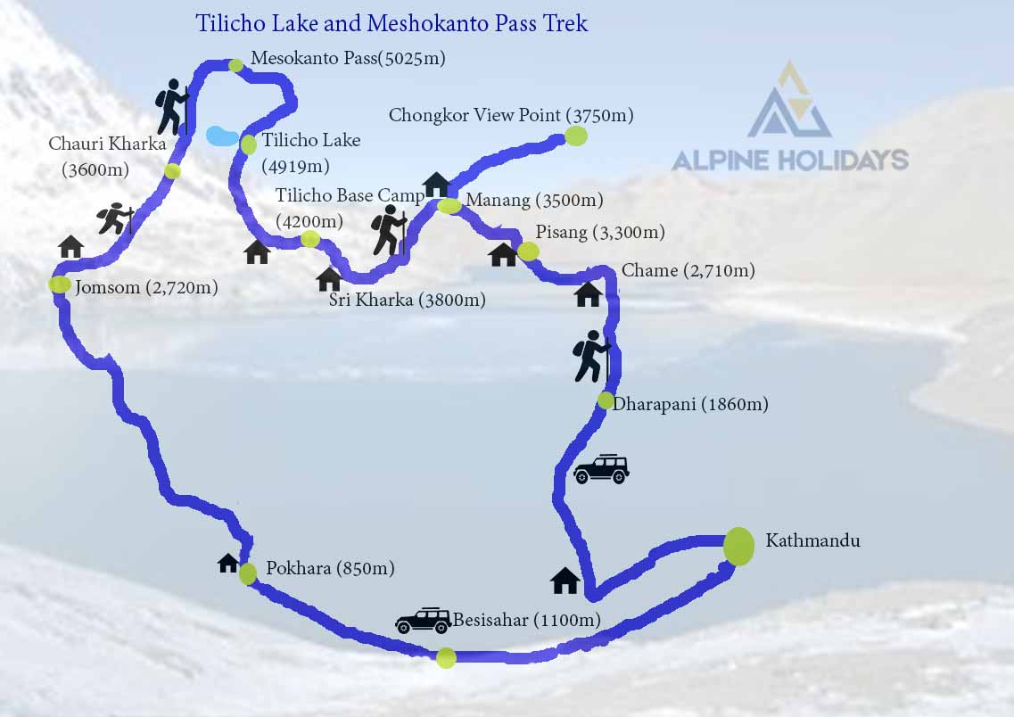 Tilicho and Meshokanto Pass Trek starts with 6 hours drive to Besisahar and further 30 minutes drive to Kudi. Our trek goes on Marshyangdi valley through beautiful villages of Jagat, Dharapani, Chame, Pisang, and Manang. We stay Manang for 2 nights to get acclimatization and leave Around Annapurna Trail to Throrong La Pass and head towards Tilicho Lake. From Tilicho Base Camp, we trek to the most beautiful Tilicho Lake and spend overnight at tented camp before we pass Meshokanto Pass. To cross the pass, we need crampons, ropes and few other types of equipment as the pass is steeper and remains always covered with ice. After crossing the pass, we stay Kaisang on Tented Camp before descending to Jomsom. From Jomsom, we take a flight back to Pokhara and to Kathmandu and end our trek.